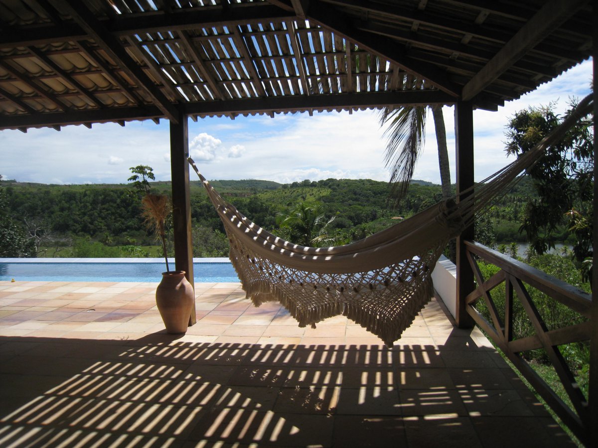 A área externa inclui terraço com cadeiras de sol, redes, mesa e extra-freezer.